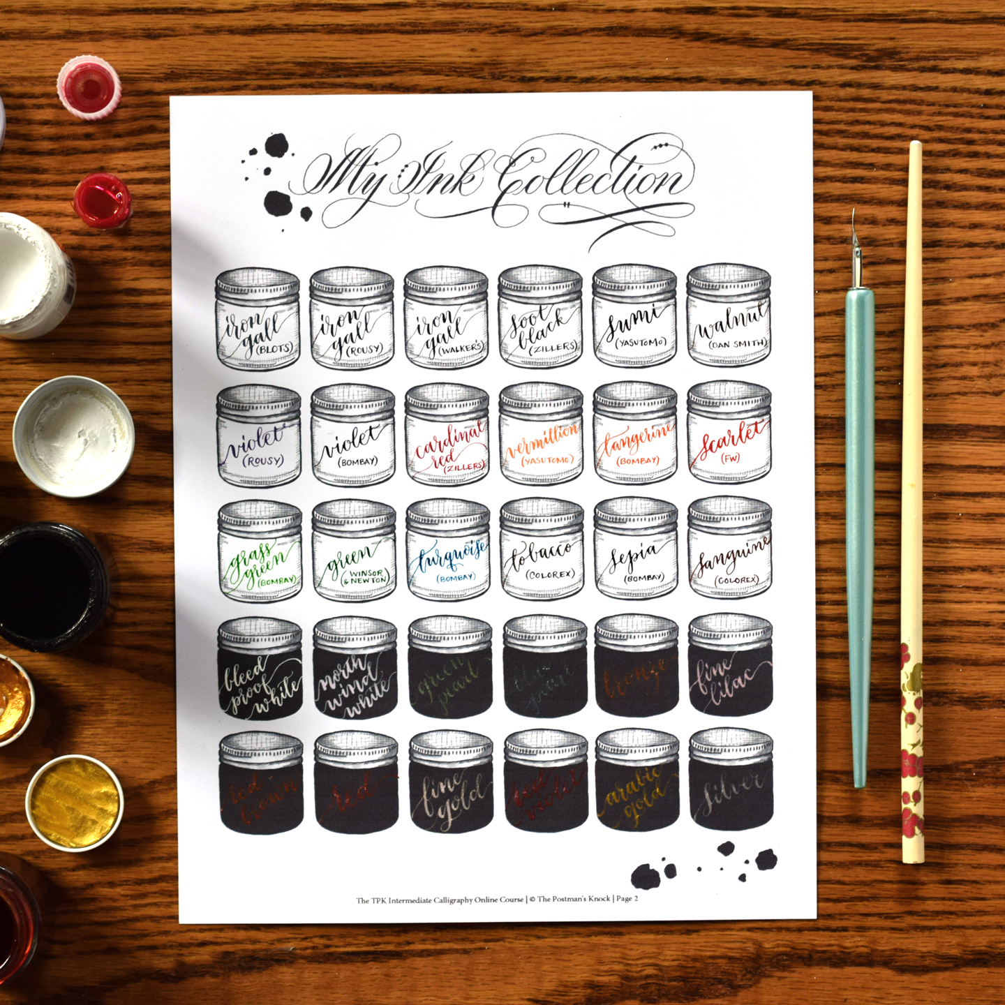 To take the course, you’ll just need the course worksheet (print it out on 32# laserjet paper) and a dip pen, a nib, and ink. Whatever you’ve been using as a beginner is perfect!