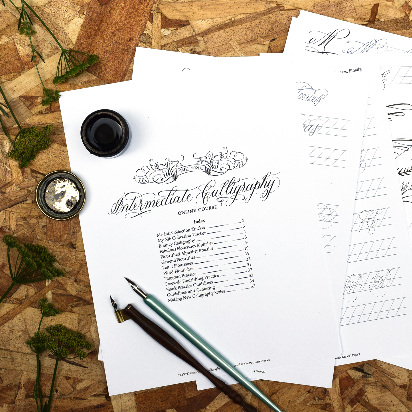 This self-paced intermediate calligraphy online course is the most comprehensive course yet to grace the TPK site! Without constraints on time or demonstration limitations, I was able to film everything I want to show you — from how to use certain inks to fun flourishing techniques. You can pause and re-watch videos as needed, and if you don’t quite understand how to do something, there’s a “Discussion” portion under each lesson where you can ask questions! All lessons include a short quiz, and most lessons include homework assignments.