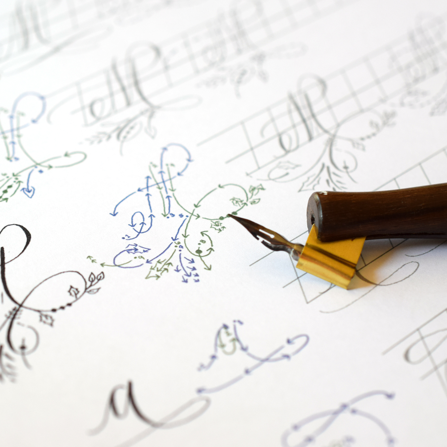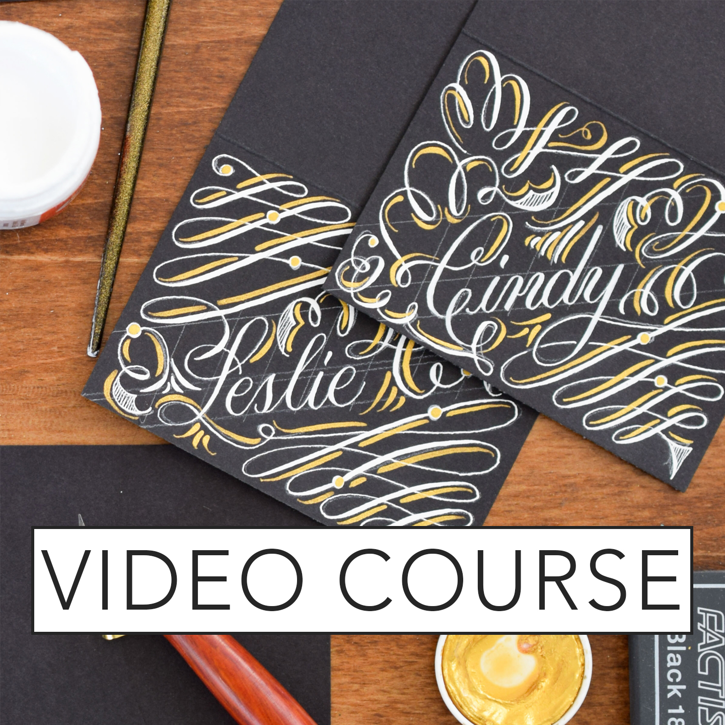 • The flourishing section will help you make organic-looking flourishes with confidence and grace! You’ll learn how to flourish individual letters, how to flourish words, and how to make white and gold reinforcement flourishes.