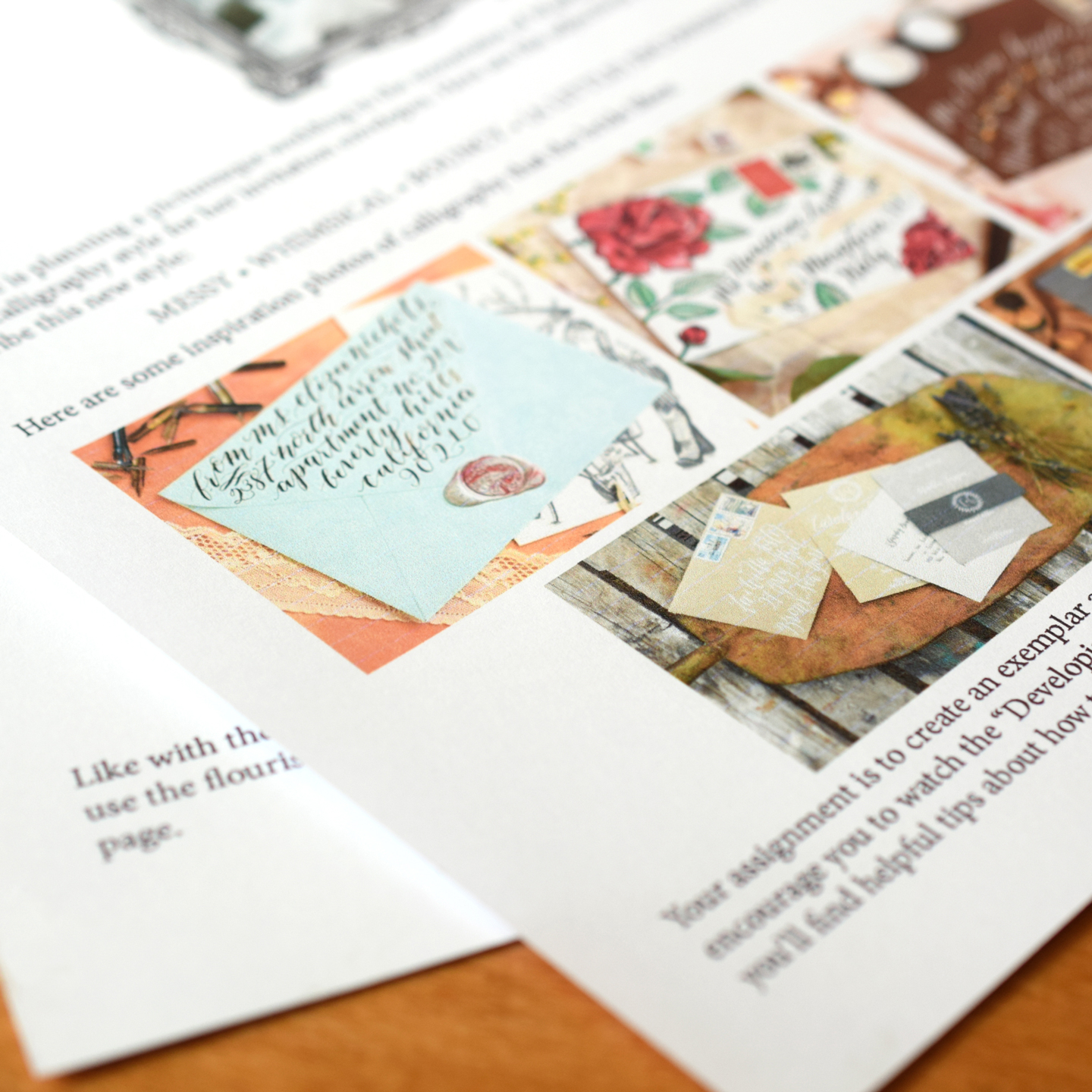 • Part of being an intermediate calligrapher is inventing your own calligraphy styles. In this lesson, I’ll give you “clients” to create projects for. You’ll need to submit photos of your projects to me in the lesson quiz. (Don’t worry if you’re technologically challenged — it’s easy to upload the photos, I promise!)